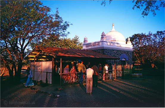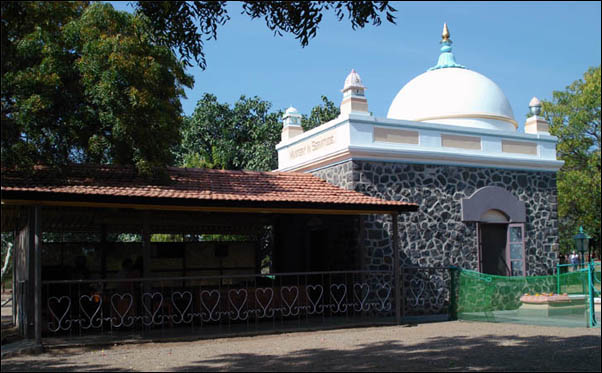 这座在美拉巴德山上的小石屋多年来一直被简称为 “圆顶”,里面安放着美赫巴巴的肉身。最初,它只是一个搭建在坑洞上的小棚屋,巴巴曾在那里闭关数月。他也在场地外的洞穴中独处闭关。这个洞穴是应他的要求于1927年挖掘的。小屋四周有围墙,东侧有一扇门和一扇窗,屋顶由铁皮搭建而成。1938年,它被改造成一个圆顶建筑,如今成为巴巴的陵墓。陵墓内部装饰着由瑞士艺术家海伦·达姆创作的精美壁画。圆顶的四角各有一个世界主要宗教的象征:基督教的十字架、伊斯兰教的新月、琐罗亚斯德教的火焰,以及印度教的神庙。这座雪白建筑的门楣上刻有铭文“在奴役中主宰”。