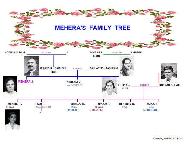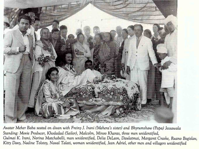 阿瓦塔美赫巴巴坐在椅榻上,两边是馥芮妮·J·伊朗尼 (美婼的姐姐) 和比拉姆肖 (帕帕)·杰萨瓦拉